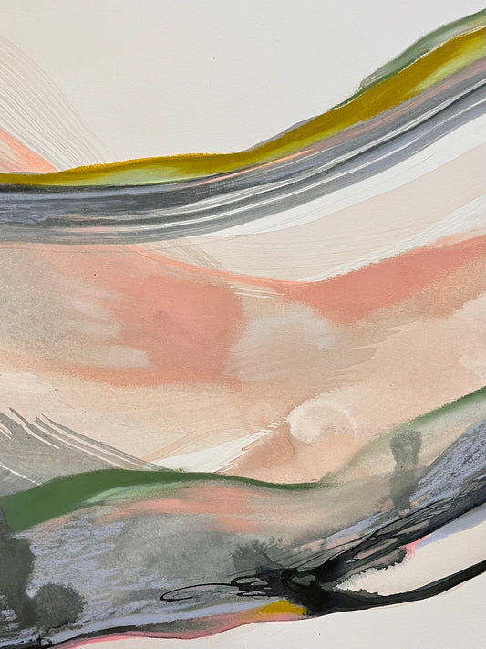 Through soft lines and flowing colour, Sarah captures the essence of her memories living on the West Coast. Her work reflects the quiet rhythm of watching waves roll endlessly onto the shore, and the serenity found in observing the ever-changing landscape of the coast. Utilizing a combination of acrylic paint, ink, oil pastels and pencil crayon, this series of paintings invites the viewer to pause and appreciate these natural moments.